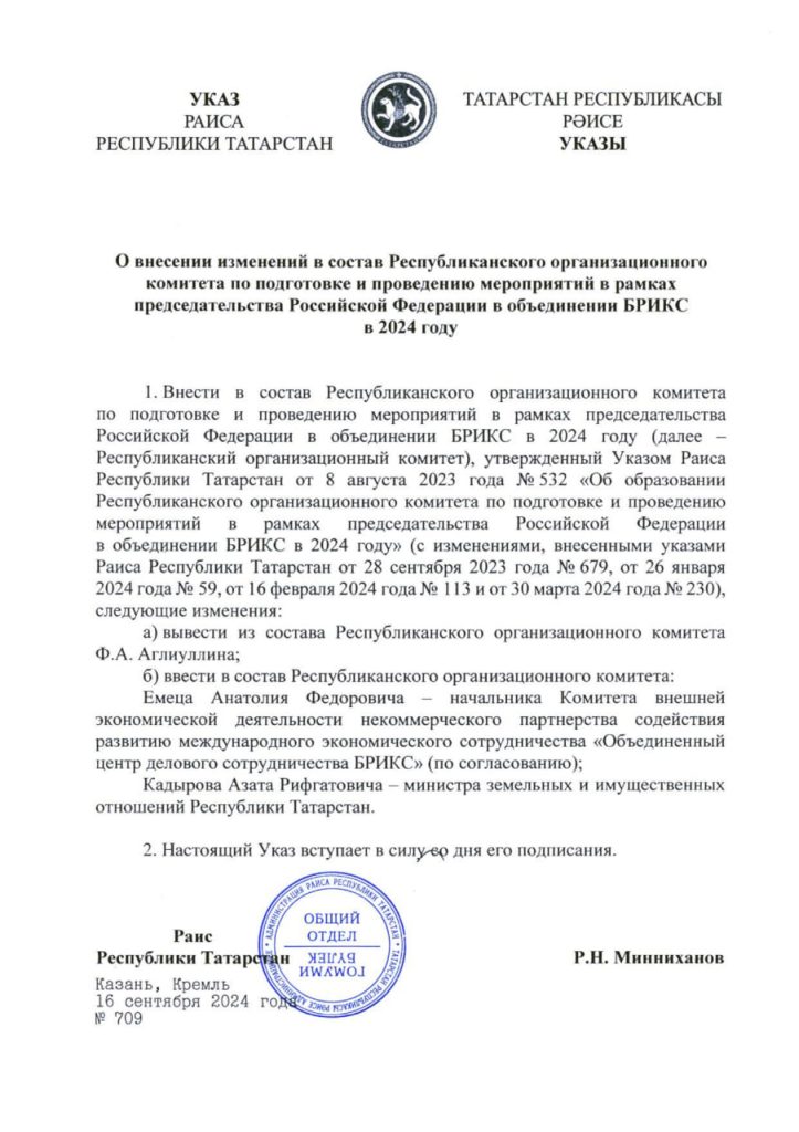 | Указом РАИСА Республики ТАТАРСТАН Р.Н. Минниханова №709 от 16 сентября 2024 года руководитель Комитета внешней экономической деятельности объединенного центра делового сотрудничества «БРИКС» ЕМЕЦ Анатолий Фёдорович введен в состав Республиканского комитета по подготовке и проведению мероприятий в рамках председательства Российской Федерации в объединении БРИКС в 2024 году. |