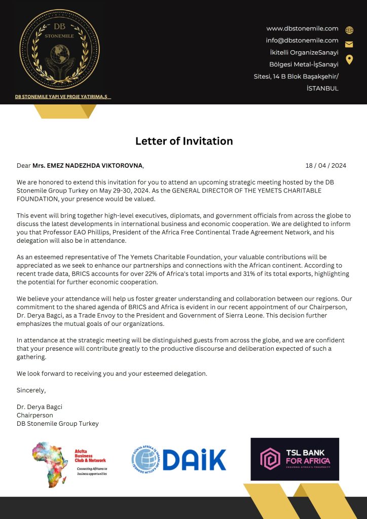 | 18.04.2024. Уважаемая госпожа ЕМЕЦ НАДЕЖДА ВИКТОРОВНА, Для нас большая честь направить вам приглашение принять участие в предстоящем стратегическом совещании Africa Eurasia Investment Summit, организованном BD. Stonemile Group Турция, 29-30 мая 2024 года в качестве ГЕНЕРАЛЬНОГО ДИРЕКТОРА БЛАГОТВОРИТЕЛЬНОЙ ФОНДА «ЕМЕЦ», ваше присутствие будет оценено по достоинству. В этом мероприятии соберутся высокопоставленные руководители, дипломаты и правительственные чиновники со всего мира, чтобы обсудить последние события в сфере международного бизнеса и экономического сотрудничества. Мы рады сообщить вам, что профессор Е.А.О. Филлипс, президент e Africa Free Continental Trade Agreement Network, и его делегация также будет присутствовать. |
